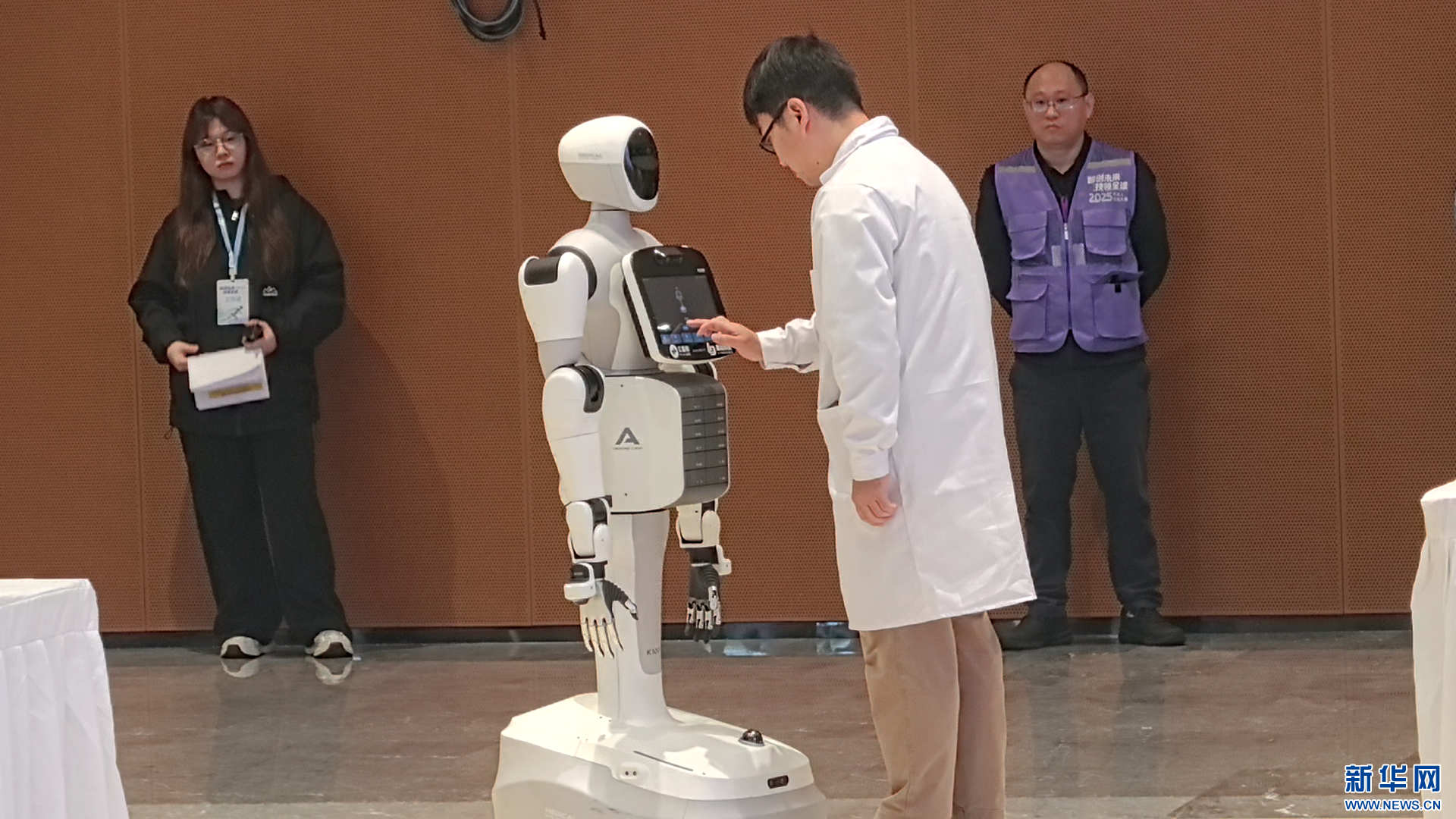 参赛选手给“护理”机器人下达指令,让它运送药箱。新华网 魏晓航 摄